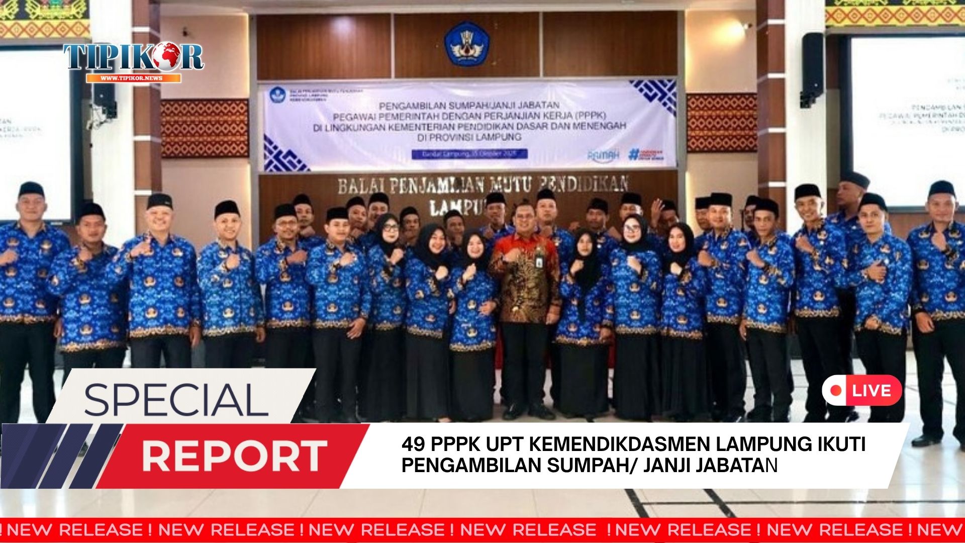 Bandar Lampung, Tipikor.news – Sebanyak 49 Pegawai Pemerintah dengan Perjanjian Kerja (PPPK) di lingkungan Unit Pelaksana Teknis (UPT) Kementerian Pendidikan Dasar dan Menengah (Kemendikdasmen) Provinsi Lampung mengikuti acara Pengambilan Sumpah/Janji Jabatan PPPK yang berlangsung di Aula BPMP Provinsi Lampung pada Rabu, 15 Oktober 2025.