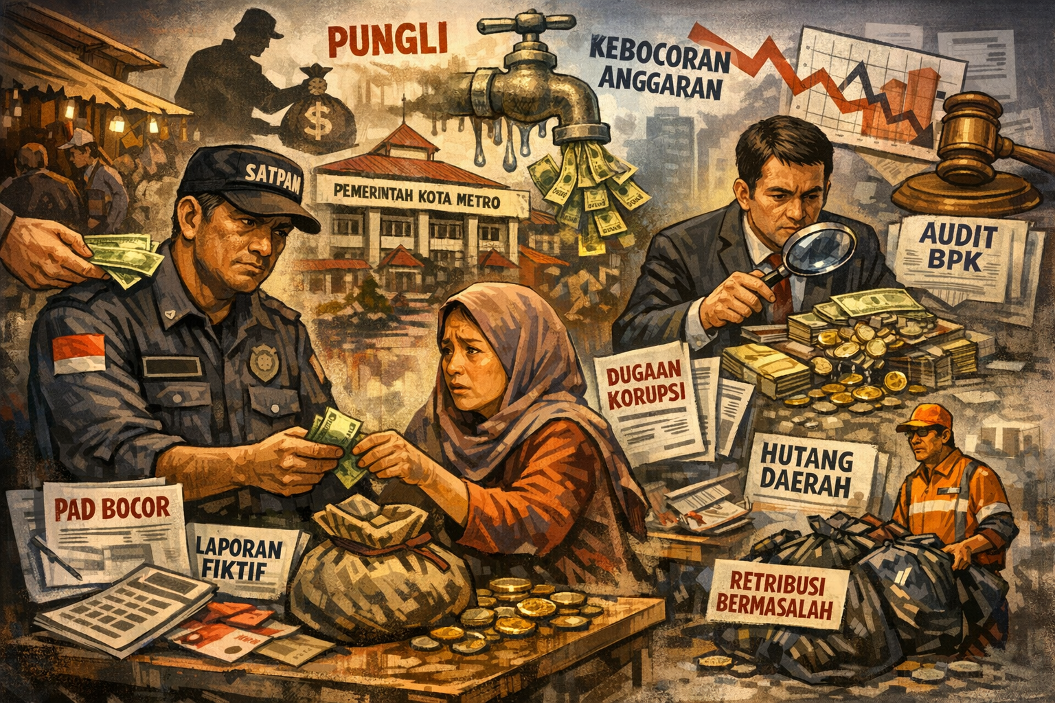 Kota Metro, Tipikor.news — Krisis fiskal yang membayangi Kota Metro kian menunjukkan wajah aslinya. Di tengah gencarnya narasi prestasi dan penghargaan seremonial yang didengungkan Pemerintah Kota, fakta-fakta di lapangan justru mengungkap ironi yang mencemaskan: dugaan kebocoran Pendapatan Asli Daerah (PAD), lemahnya pengawasan internal, hingga praktik penarikan iuran ilegal yang membebani rakyat kecil.