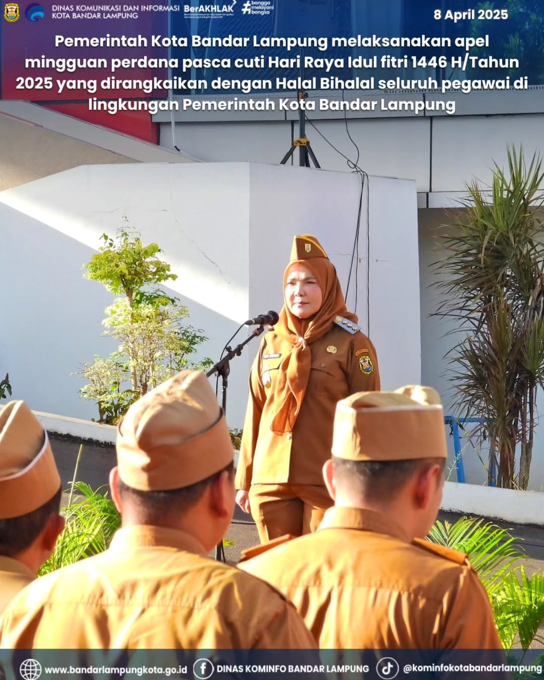 Pemerintah Kota Bandar Lampung melaksanakan apel mingguan perdana pasca cuti Hari Raya Idulfitri 1446 H/Tahun 2025 yang dirangkaikan dengan kegiatan Halal Bihalal seluruh pegawai di lingkungan Pemerintah Kota Bandar Lampung, Selasa (8/4/2025).