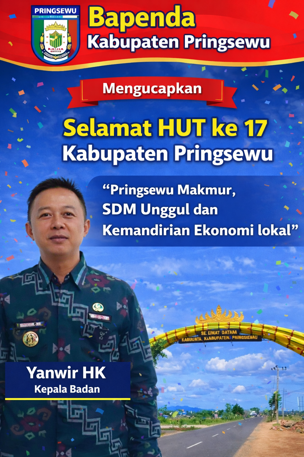 βSelamat HUT ke-17 Kabupaten Pringsewu. Semoga dengan tema Pringsewu Makmur, SDM Unggul dan Kemandirian Ekonomi Lokal, seluruh pihak dapat terus bersinergi dalam meningkatkan kualitas sumber daya manusia serta mendorong pertumbuhan ekonomi daerah,β ujar Yanwir.