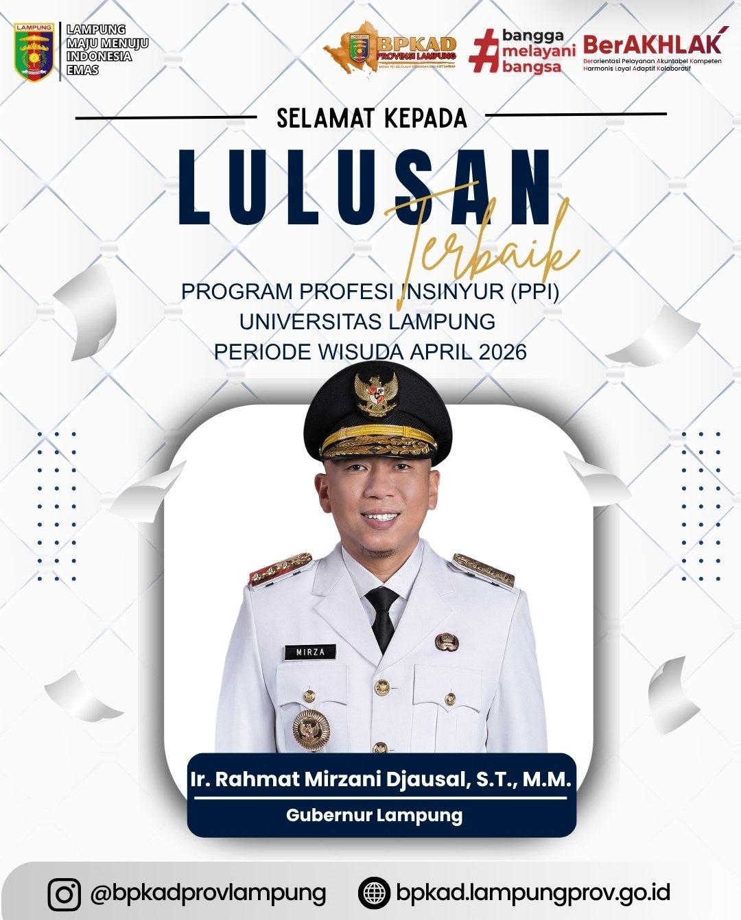 Bandar Lampung, Tipikor News β€” Kepala Badan Pengelolaan Keuangan dan Aset Daerah (BPKAD) Provinsi Lampung, Nurul Fajri, menyampaikan ucapan selamat dan apresiasi kepada Gubernur Lampung, Rahmat Mirzani Djausal, atas capaian akademiknya sebagai Lulusan Terbaik Program Profesi Insinyur (PPI) di Universitas Lampung pada periode wisuda April 2026.