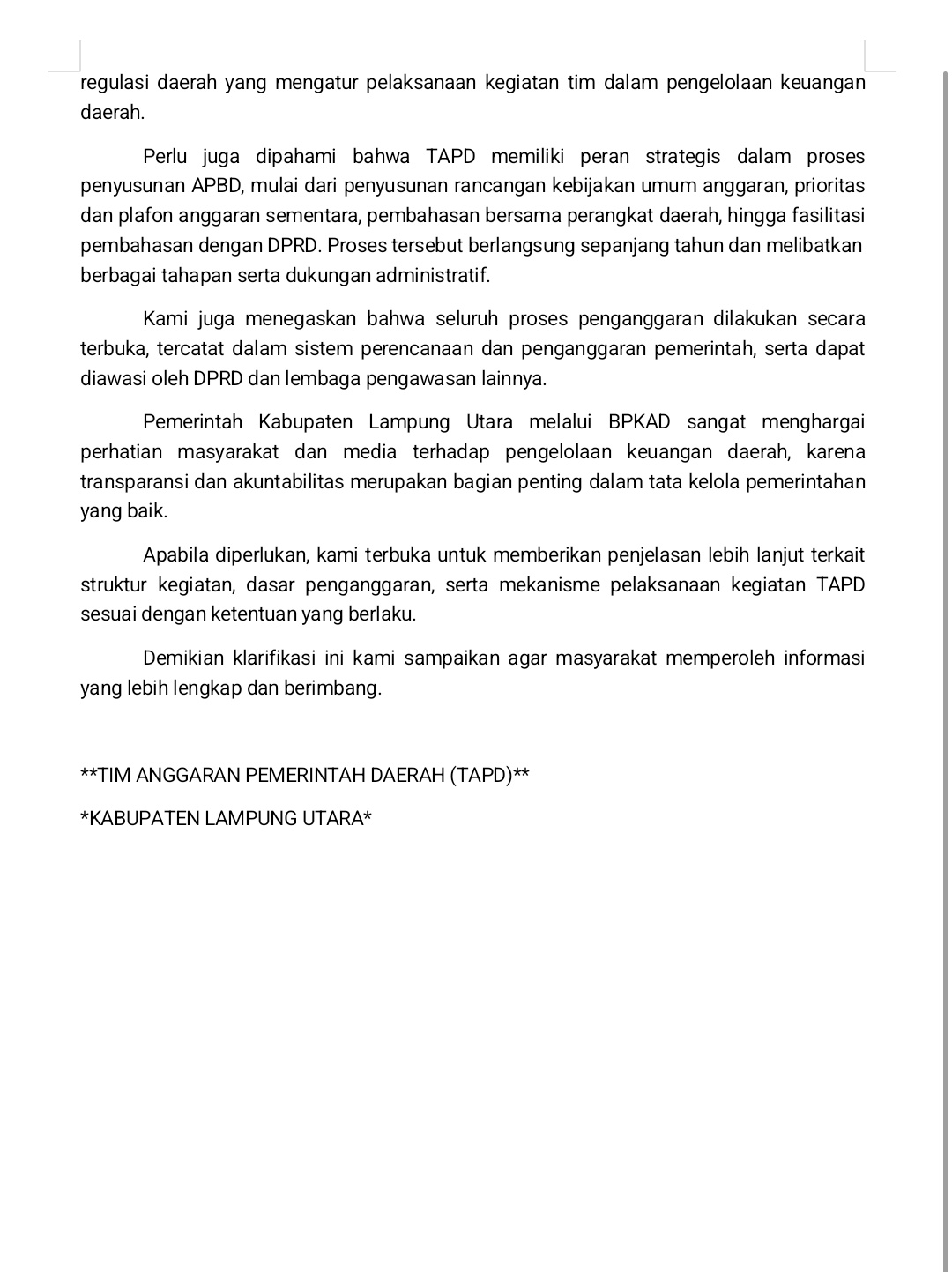 Pemerintah Kabupaten Lampung Utara melalui BPKAD menyatakan menghargai perhatian masyarakat dan media terhadap pengelolaan keuangan daerah. Menurutnya, transparansi dan akuntabilitas merupakan bagian penting dalam tata kelola pemerintahan yang baik.