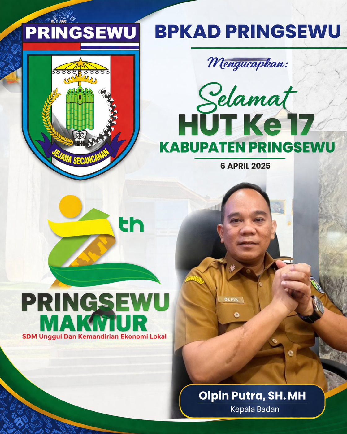 Pringsewu, Tipikor News β Badan Pengelolaan Keuangan dan Aset Daerah (BPKAD) Kabupaten Pringsewu turut menyampaikan ucapan selamat dalam rangka Hari Ulang Tahun (HUT) ke-17 Kabupaten Pringsewu yang diperingati pada 6 April 2025.