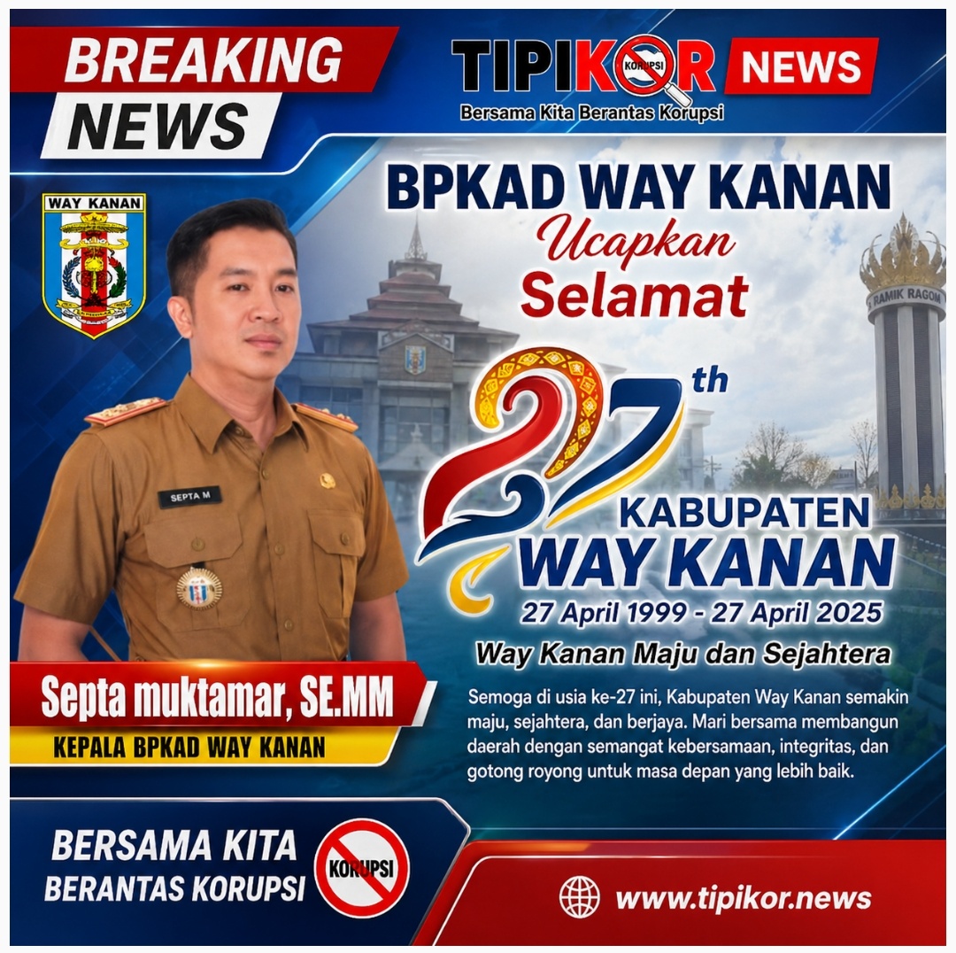 Way Kanan, Tipikor News β€” Badan Pengelolaan Keuangan dan Aset Daerah (BPKAD) Kabupaten Way Kanan menyampaikan ucapan selamat Hari Ulang Tahun (HUT) ke-27 Kabupaten Way Kanan yang jatuh pada 27 April 2026.