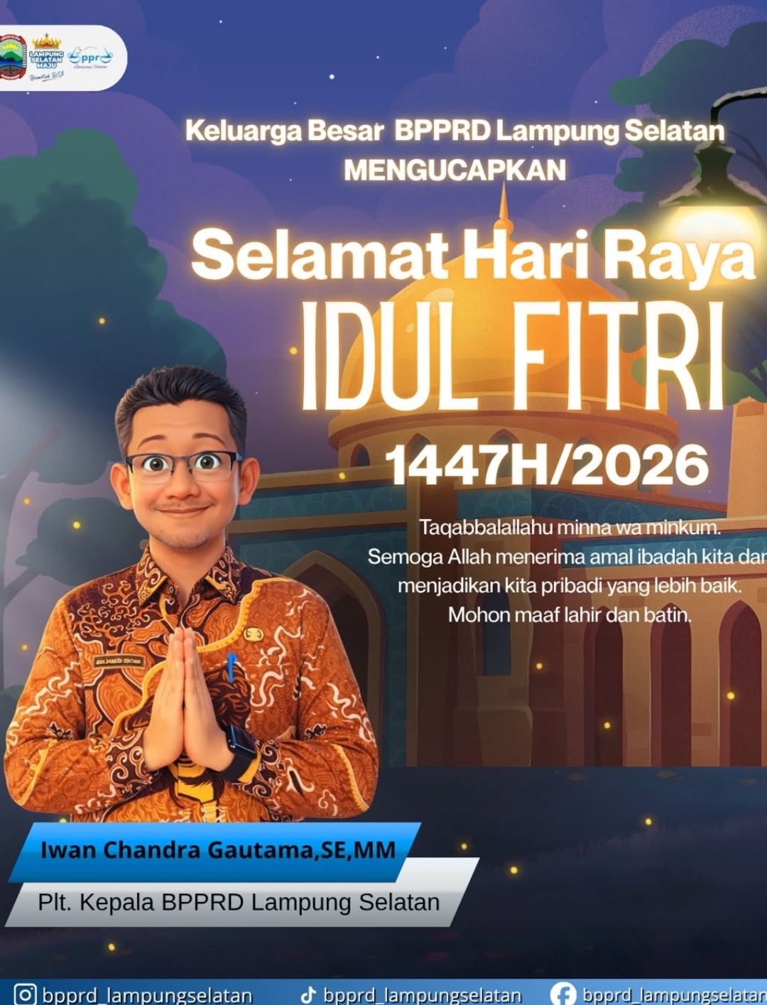Lampung Selatan, Tipikor News β Dalam suasana penuh kebahagiaan dan keberkahan Hari Raya Idul Fitri 1447 Hijriah/2026 Masehi, Keluarga Besar Badan Pengelolaan Pajak dan Retribusi Daerah (BPPRD) Kabupaten Lampung Selatan menyampaikan ucapan selamat kepada seluruh masyarakat, khususnya umat Muslim yang merayakan hari kemenangan usai menjalankan ibadah puasa Ramadan.