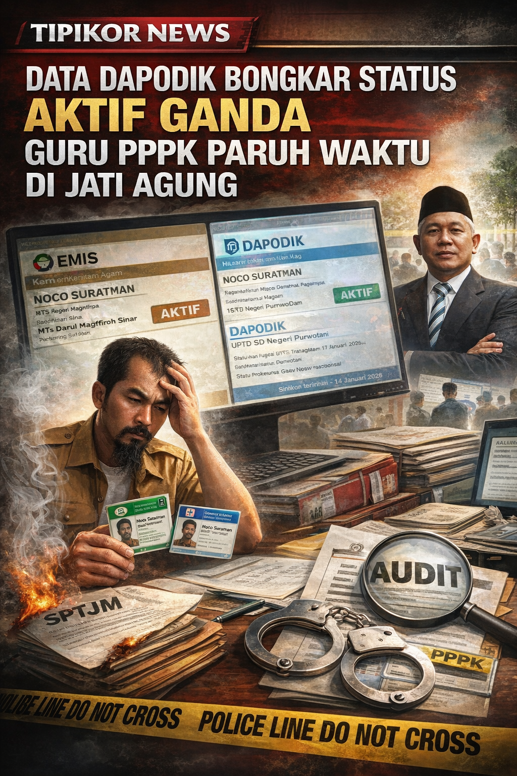 Lampung Selatan, TIPIKOR NEWS — Tirai dugaan carut-marut administrasi pengangkatan PPPK Paruh Waktu di Kecamatan Jati Agung kian tersingkap. Data resmi negara dari DAPODIK dan SIMPKB kini berbicara lantang, mengungkap status aktif ganda seorang guru lintas kementerian—sebuah kondisi yang seharusnya mustahil terjadi dalam tata kelola ASN.