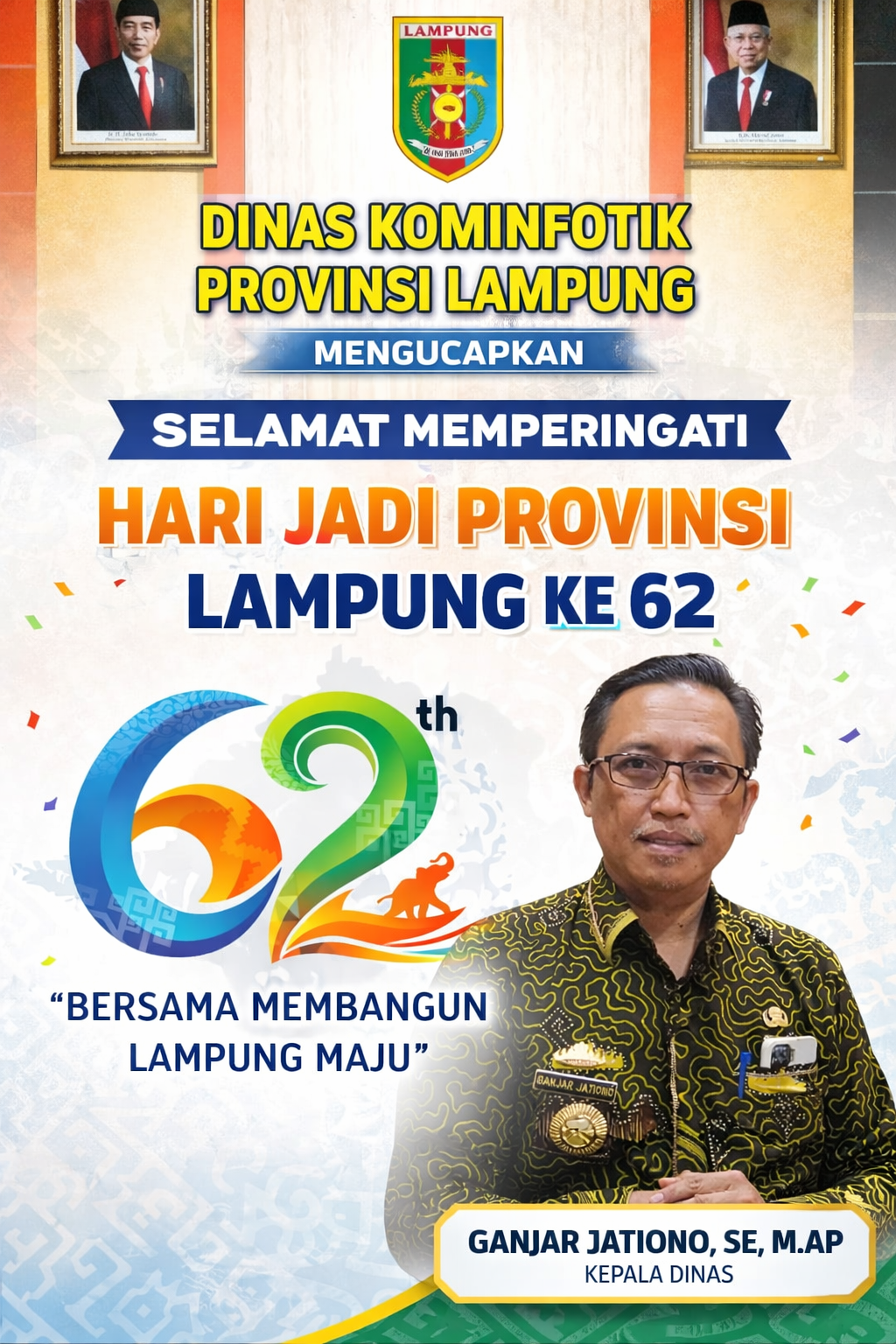 Bandar Lampung — Dinas Komunikasi, Informatika, dan Statistik (Kominfotik) Provinsi Lampung menyampaikan ucapan selamat dalam rangka memperingati Hari Jadi Provinsi Lampung ke-62.