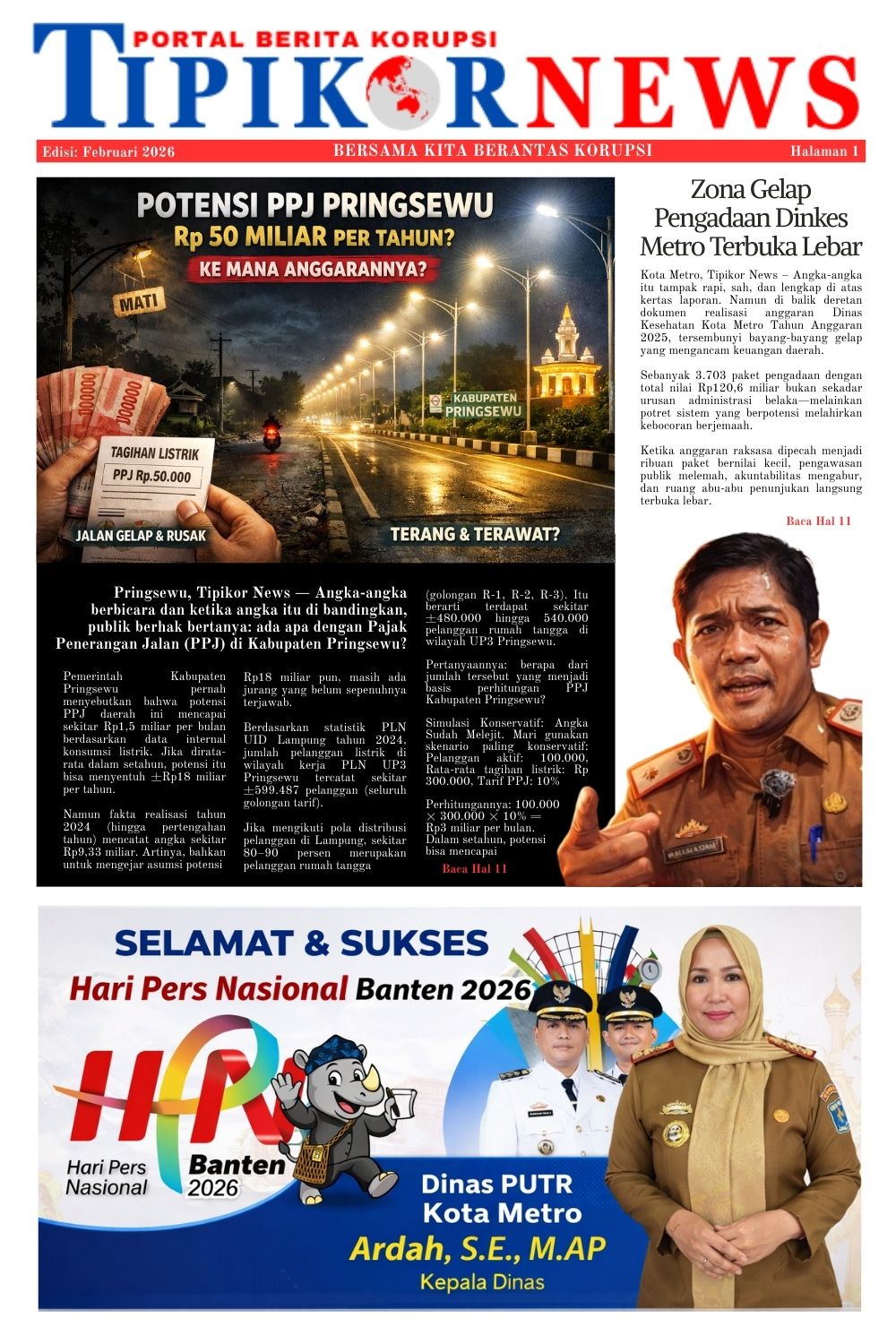 Kota Metro, Tipikor News β Semangat Hari Pers Nasional (HPN) 2026 yang digelar di Banten menjadi momentum penting untuk meneguhkan kembali peran strategis pers dalam pembangunan bangsa. Dinas Pekerjaan Umum dan Tata Ruang (PUTR) Kota Metro turut menyampaikan ucapan selamat dan apresiasi setinggi-tingginya kepada seluruh insan pers di Indonesia.