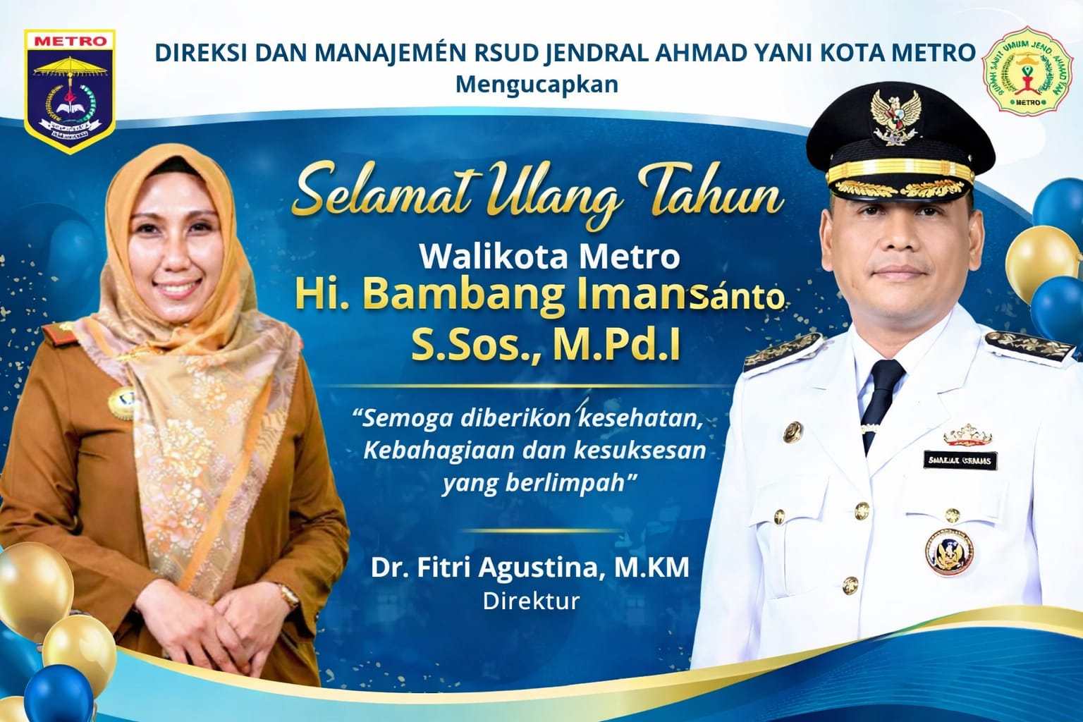 Direktur RSUD Jenderal Ahmad Yani Kota Metro, Dr. Fitri Agustina, M.KM, mewakili seluruh jajaran direksi dan manajemen, menyampaikan harapan tulus di hari bahagia orang nomor satu di Kota Metro tersebut.