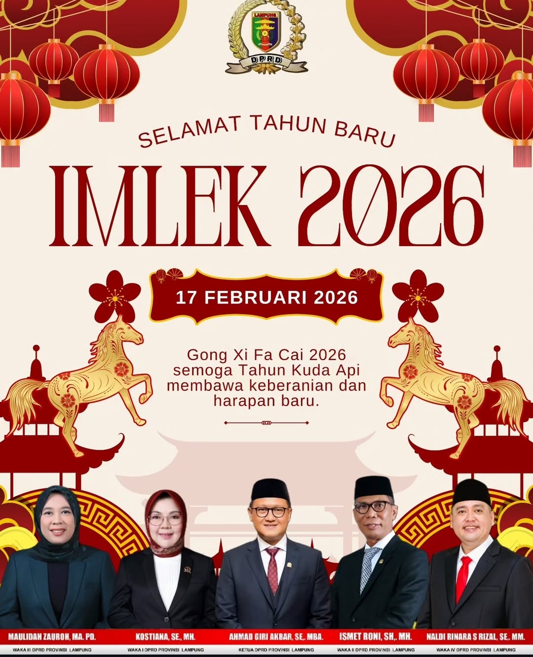 Melalui pesan resmi bertema Gong Xi Fa Cai 2026, DPRD Provinsi Lampung berharap perayaan Imlek yang jatuh pada 17 Februari 2026 ini dapat membawa semangat baru, keberanian, serta harapan yang lebih baik bagi seluruh lapisan masyarakat.