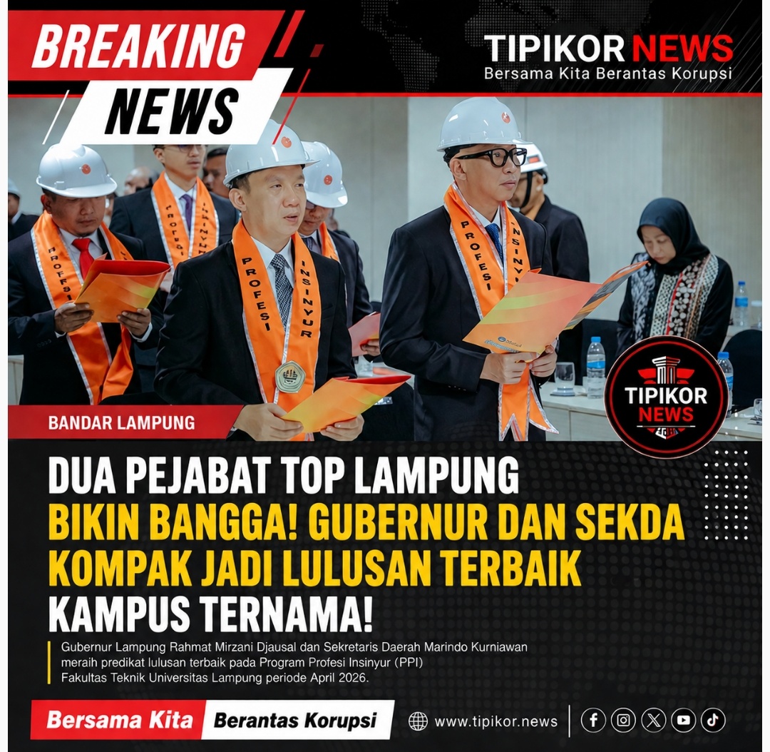 Bandar Lampung, Tipikor News – Prestasi membanggakan kembali ditorehkan dua pejabat utama Pemerintah Provinsi Lampung. Gubernur Lampung Rahmat Mirzani Djausal dan Sekretaris Daerah Provinsi Lampung Marindo Kurniawan berhasil meraih predikat lulusan terbaik pada Program Profesi Insinyur (PPI) Fakultas Teknik Universitas Lampung periode April 2026.