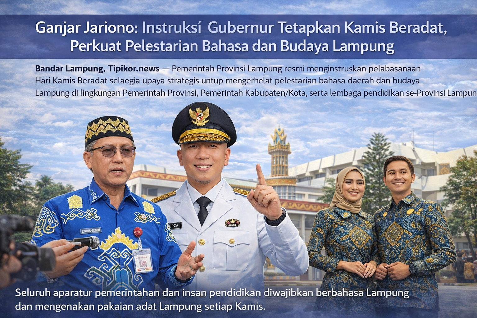 Bandar Lampung, Tipikor.news – Pemerintah Provinsi Lampung resmi menginstruksikan pelaksanaan Hari Kamis Beradat sebagai upaya strategis untuk memperkuat pelestarian bahasa daerah dan budaya Lampung di lingkungan Pemerintah Provinsi, Pemerintah Kabupaten/Kota, serta lembaga pendidikan se-Provinsi Lampung.