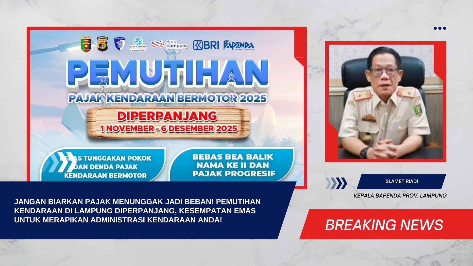 Bandar Lampung, Tipikor.news – Warga Lampung yang budiman, kabar baik datang lagi! Pemerintah Provinsi Lampung memperpanjang program pemutihan pajak kendaraan bermotor (PKB) hingga 6 Desember 2025. Ini adalah kesempatan emas bagi Anda untuk merapikan administrasi kendaraan tanpa harus khawatir dengan denda yang menumpuk.