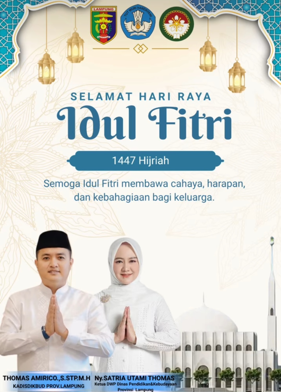 Bandar Lampung, Tipikor News β Kepala Dinas Pendidikan dan Kebudayaan Provinsi Lampung, Thomas Amirico, S.STP., M.H., bersama Ketua Dharma Wanita Persatuan (DWP) Disdikbud Provinsi Lampung, Ny. Satria Utami Thomas, menyampaikan ucapan Selamat Hari Raya Idul Fitri 1447 Hijriah kepada seluruh masyarakat, khususnya insan pendidikan di Provinsi Lampung.