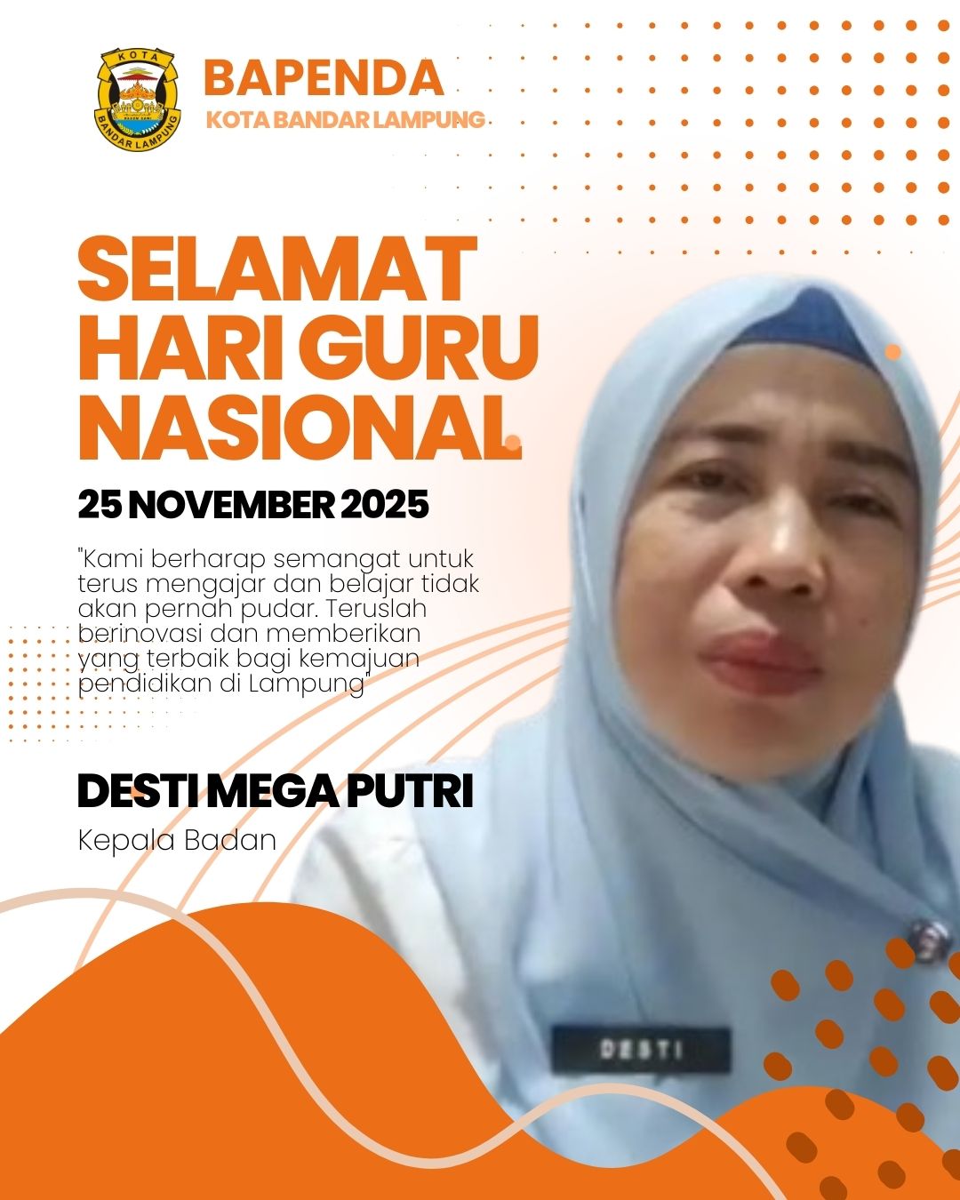 Bandar Lampung, Tipikor.news – Kepala Badan Pendapatan Daerah (Bapenda) Kota Bandar Lampung, Desti Mega Putri, menyampaikan apresiasi yang setinggi-tingginya kepada seluruh guru di Kota Tapis Berseri dalam rangka memperingati Hari Guru Nasional yang jatuh pada tanggal 25 November 2025.