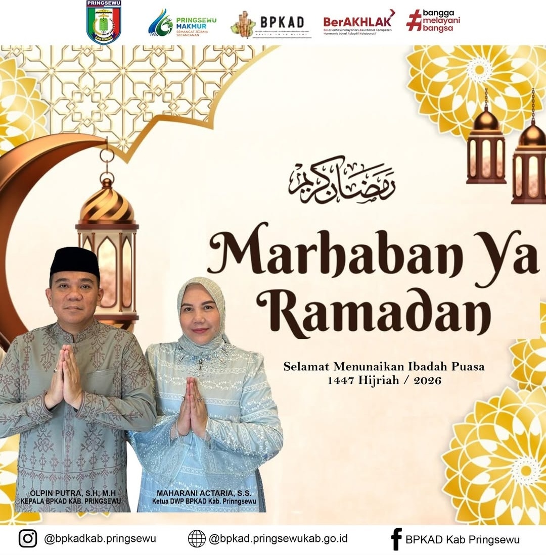 βMarhaban ya Ramadhan. Atas nama pribadi dan keluarga besar BPKAD Kabupaten Pringsewu, saya mengucapkan selamat menunaikan ibadah puasa Ramadhan 1447 H. Semoga di bulan yang penuh berkah ini kita senantiasa diberikan kesehatan, kekuatan, dan kelancaran dalam menjalankan setiap ibadah,β kata Olpin, Senin (2/3/2026).