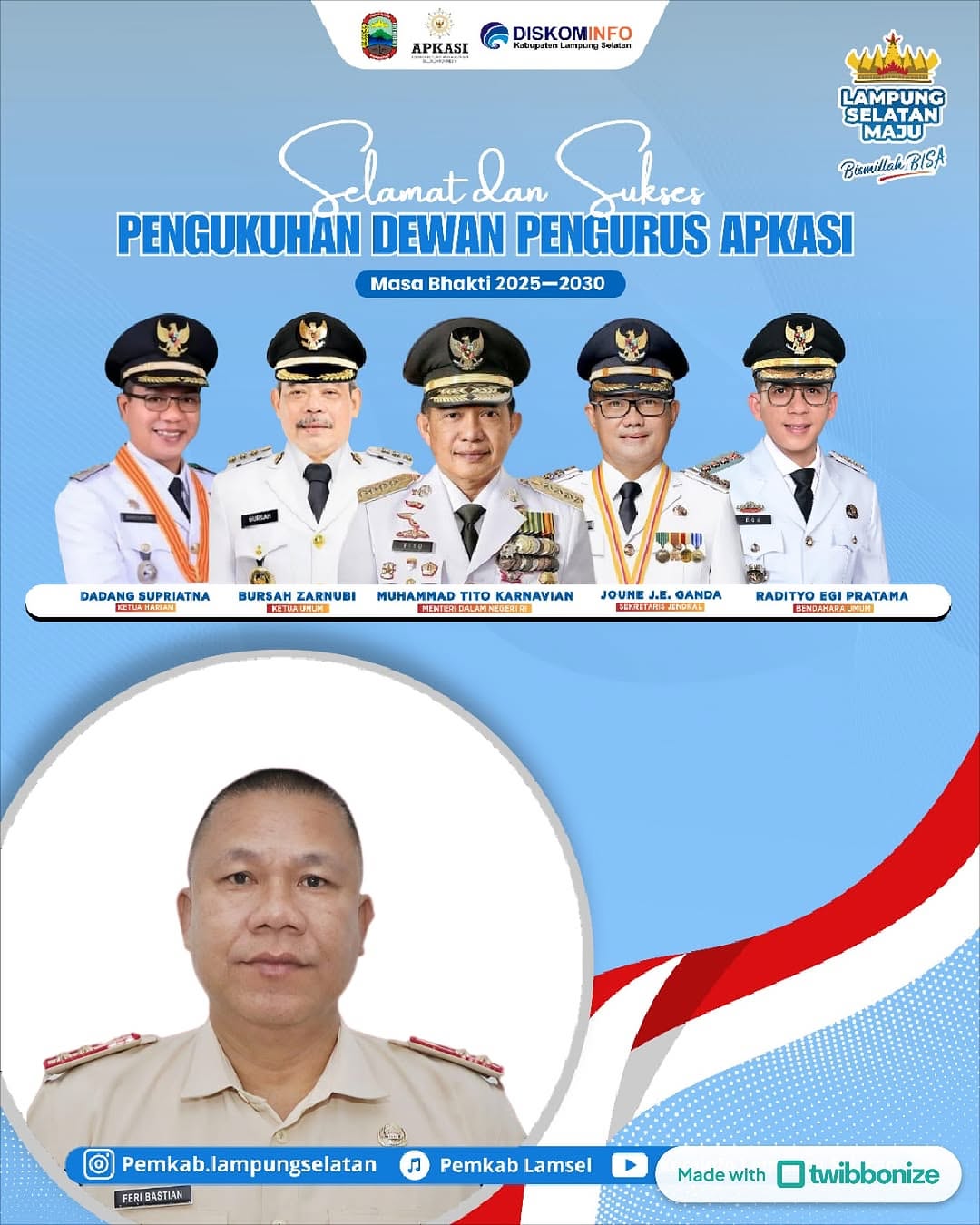 Lampung Selatan, Tipikor.news – Kepala BPPRD Kabupaten Lampung Selatan Feri Bastian mengucapkan selamat dan sukses atas dilantiknya jajaran pengurus Asosiasi Pemerintah Kabupaten Seluruh Indonesia (Apkasi) masa bakti 2025-2030 oleh Menteri Dalam Negeri (Mendagri) Tito Karnavian secara resmi melantik di Jakarta, Kamis (17/7/2025).