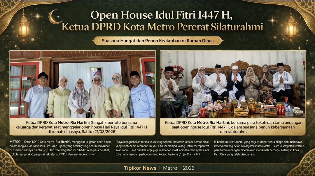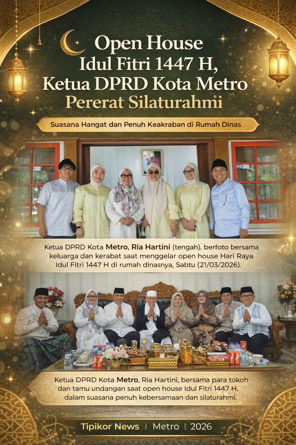 Kota Metro, Tipikor News — Ketua DPRD Kota Metro, Ria Hartini, menggelar kegiatan open house dalam rangka Hari Raya Idul Fitri 1447 Hijriah yang berlangsung penuh keakraban di rumah dinasnya, Sabtu (21/03/2026).