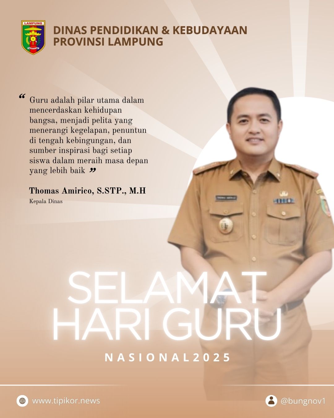 Bandar Lampung, Tipikor.news – Semangat membara dan energi positif terpancar dari Kepala Dinas Pendidikan dan Kebudayaan (Kadisdikbud) Provinsi Lampung, Thomas Amirico, S. STP., MH, saat menyampaikan ucapan Selamat Hari Guru Nasional 2025.