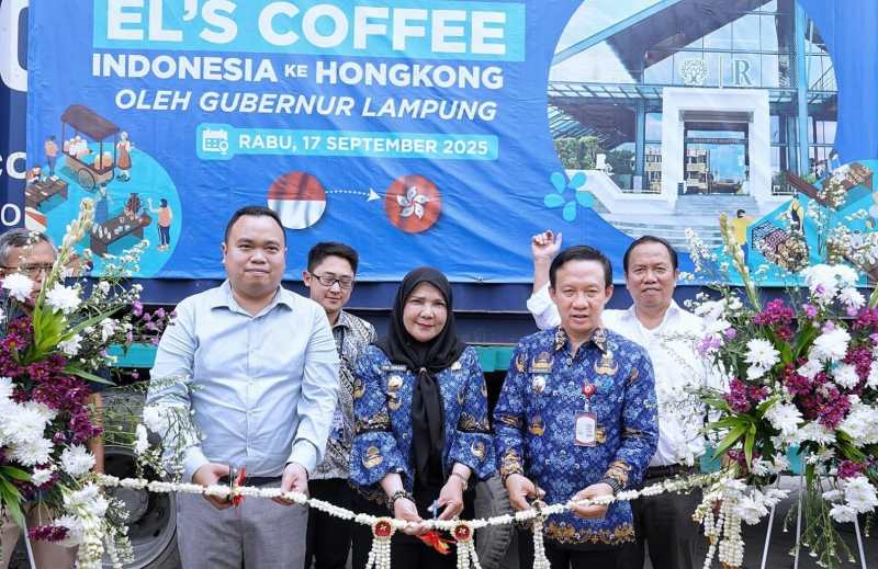 Bandar Lampung, Tipikor.news – Sekretaris Daerah Provinsi Lampung Marindo Kurniawan bersama Walikota Bandar Lampung Eva Dwiana dan Owner El’s Coffee Elkana Arlen Riswan melepas ekspor kopi di EL’s Coffee Roastery, Rabu (17/9/2025).