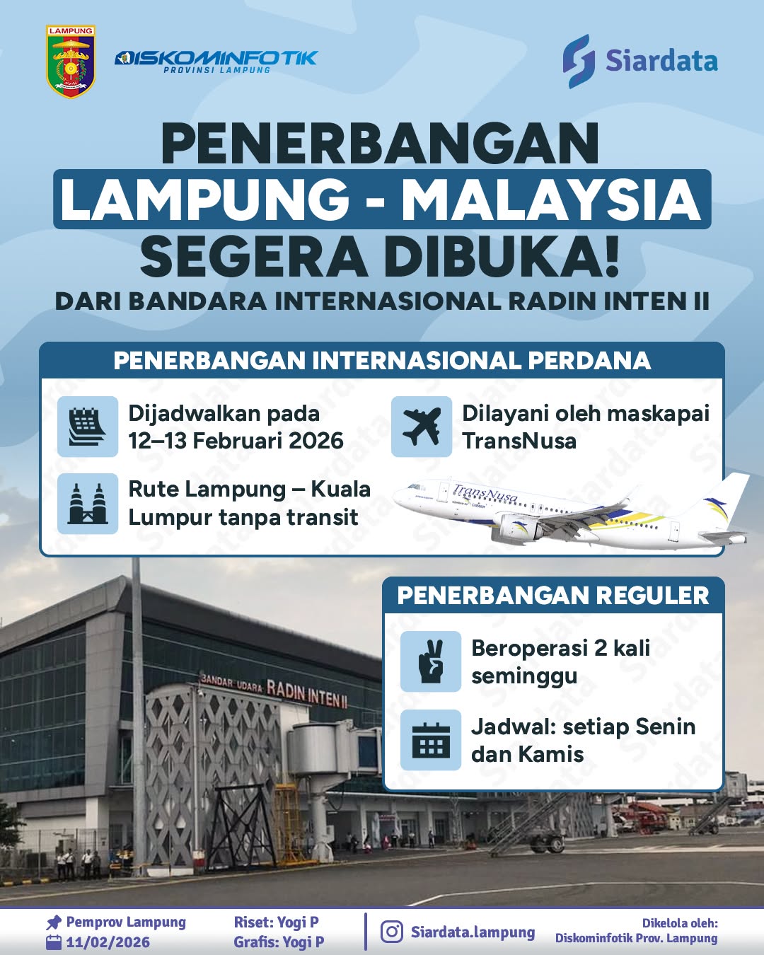 Bandar Lampung, Tipikor.news — Provinsi Lampung menorehkan sejarah baru di sektor transportasi udara. Bandar Udara Radin Inten II kini resmi berstatus bandara internasional dan langsung membuka penerbangan perdana rute Lampung–Kuala Lumpur pada 12–13 Februari 2026.