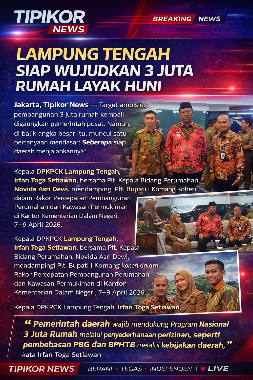 Kabupaten Lampung Tengah menjadi salah satu daerah yang ikut masuk dalam pusaran agenda nasional ini. Melalui Dinas Perumahan, Kawasan Permukiman, Pertanahan dan Cipta Karya (DPKPCK), pemerintah daerah hadir langsung dalam Rapat Koordinasi Percepatan Pembangunan Perumahan dan Kawasan Permukiman yang digelar di Kantor Kementerian Dalam Negeri, 7–9 April 2026.