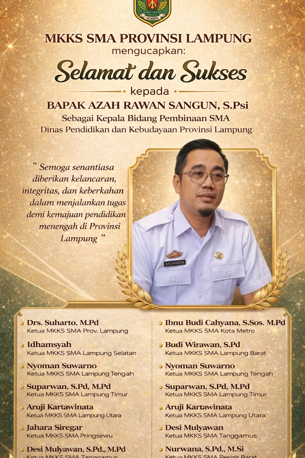 MKKS SMA Provinsi Lampung berharap, dengan kepemimpinan yang profesional dan berintegritas, pembinaan SMA di Provinsi Lampung semakin maju, adaptif, dan berdaya saing dalam menghadapi tantangan pendidikan ke depan. (Tim)