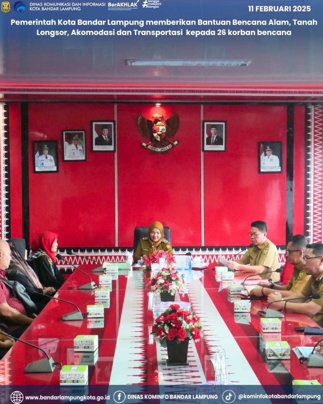 Bandar Lampung – Pemerintah Kota Bandar Lampung memberikan bantuan kepada 26 korban bencana alam, termasuk tanah longsor, kebakaran, puting beliung, serta bantuan akomodasi dan transportasi untuk pengobatan. Penyerahan bantuan dilakukan di Ruang Rapat Wali Kota pada hari Selasa, 11 Februari 2025.