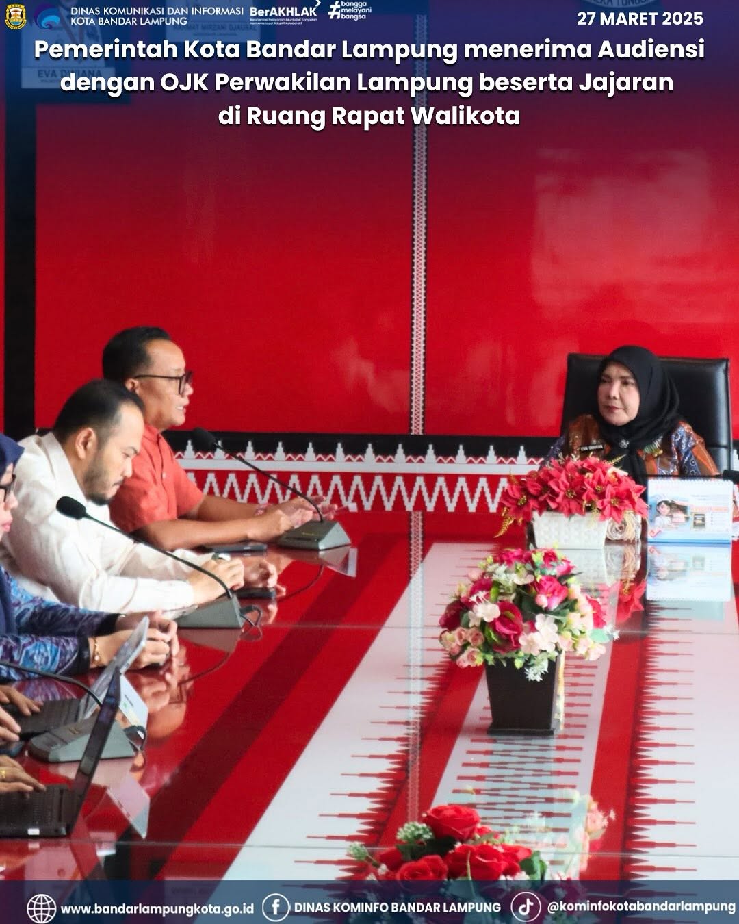 Bandar Lampung –Ā Pemerintah Kota Bandar Lampung menerima audiensi dari Otoritas Jasa Keuangan (OJK) Perwakilan Lampung beserta jajaran di Ruang Rapat Walikota, Kamis (27/3/2025). Pertemuan tersebut diterima langsung oleh Walikota Bandar Lampung Hj. Eva Dwiana bersamaĀ jajaran Pemerintah Kota Bandar Lampung.
