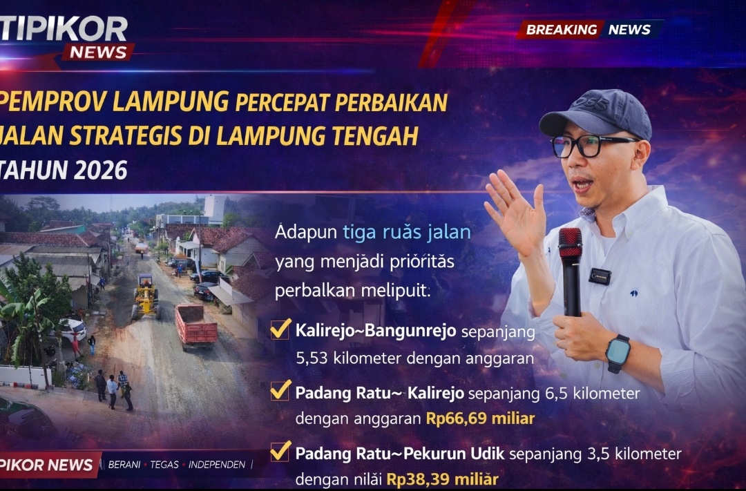 Lampung Tengah, Tipikor News — Pemerintah Provinsi Lampung terus mengakselerasi pembangunan infrastruktur dengan mempercepat perbaikan sejumlah ruas jalan strategis di Kabupaten Lampung Tengah pada tahun 2026.
