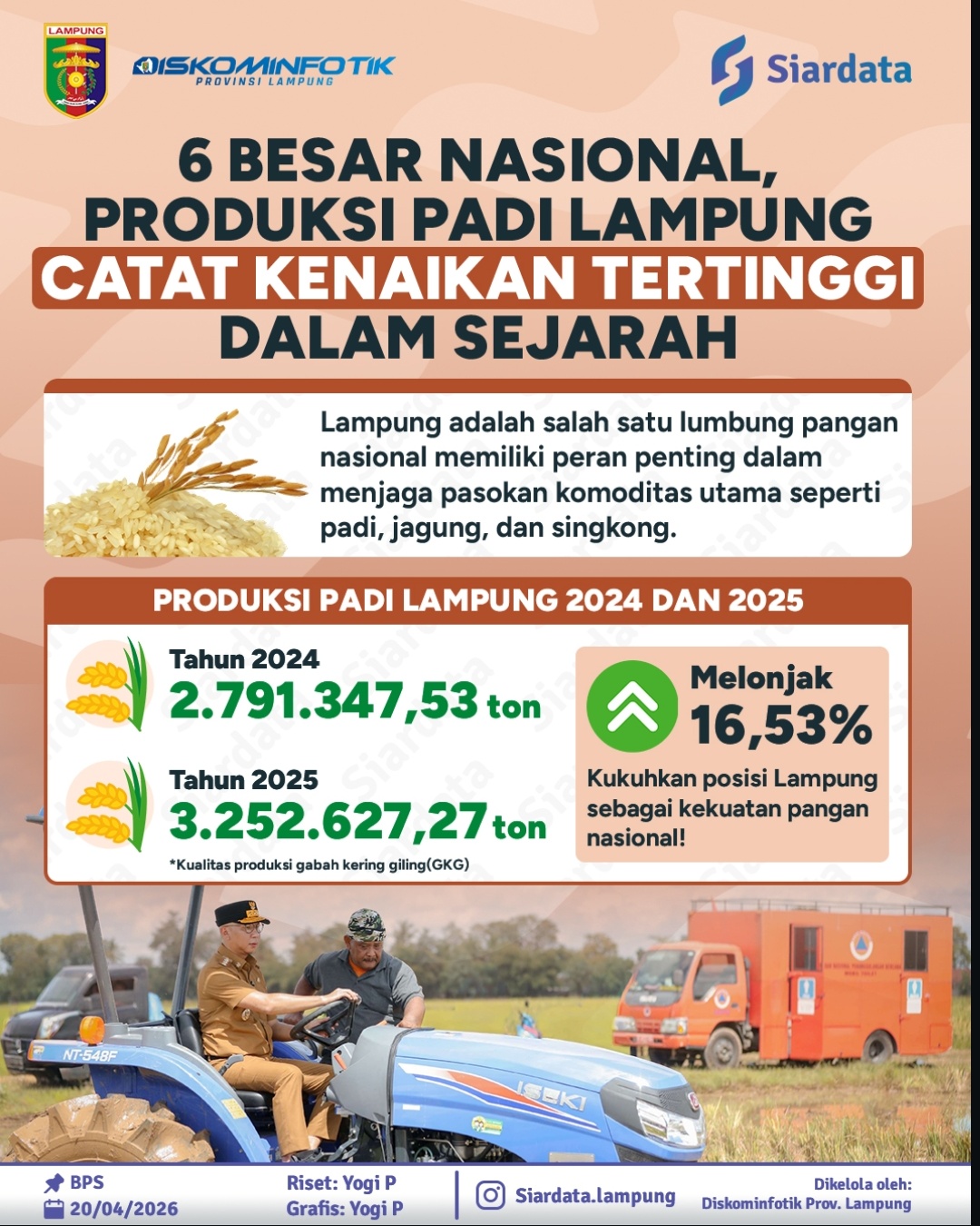 Bandar Lampung, Tipikor News β€” Produksi padi Provinsi Lampung pada tahun 2025 tercatat mencapai 3,25 juta ton atau meningkat sebesar 16,53 persen dibandingkan tahun 2024.