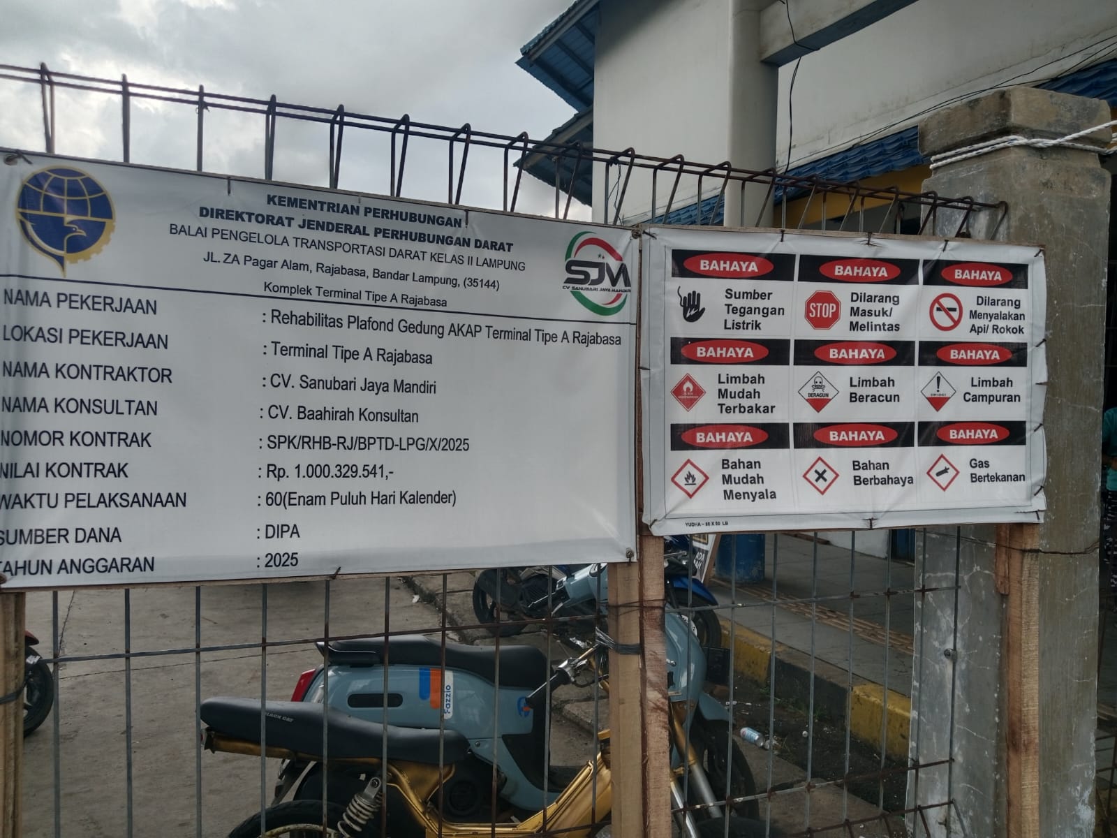 Pemandangan berisiko itu menjadi awal dari kisah kelam proyek Rehabilitasi Plafon Gedung AKAP Terminal Tipe A Rajabasa, proyek bernilai Rp1.000.329.541 yang dibiayai DIPA Tahun Anggaran 2025 di bawah Kementerian Perhubungan RI, Direktorat Jenderal Perhubungan Darat, melalui Balai Pengelola Transportasi Darat (BPTD) Kelas II Lampung.