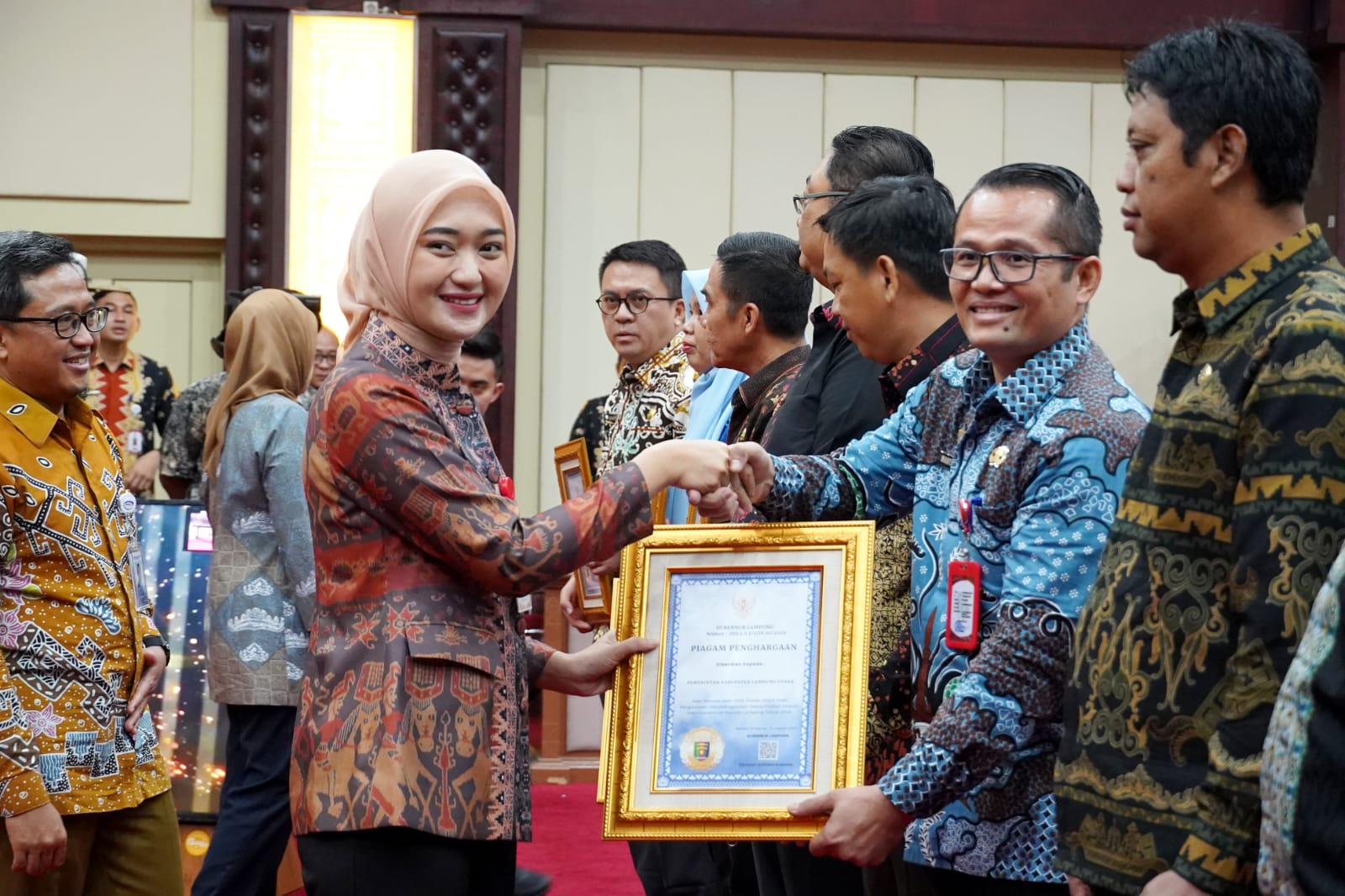 Dalam kesempatan tersebut, juga dilakukan penyerahan piagam penghargaan dari Gubernur Lampung kepada Pemerintah Kabupaten/Kota yang telah berhasil menyelesaikan 100% Tindak Lanjut Hasil Pengawasan (TLHP) untuk tahun anggaran/periode pemeriksaan tahun 2024. Penyerahan penghargaan dilakukan oleh Wakil Gubernur Lampung yang didampingi oleh Kepala Perwakilan BPKP Provnsi Lampung dan Inspektur Provinsi Lampung
