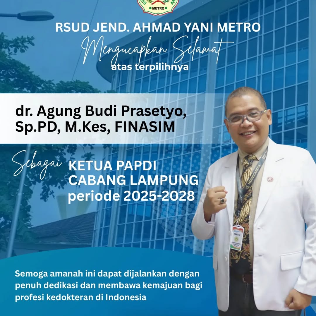Kota Metro, Tipikor.news – RSUD Jenderal Ahmad Yani Kota Metro menyampaikan ucapan selamat dan apresiasi kepada dr. Agung Budi Prasetyo, Sp.PD, M.Kes, FINASIM yang telah terpilih sebagai Ketua Perhimpunan Dokter Spesialis Penyakit Dalam Indonesia (PAPDI) Cabang Lampung untuk periode 2025–2028.