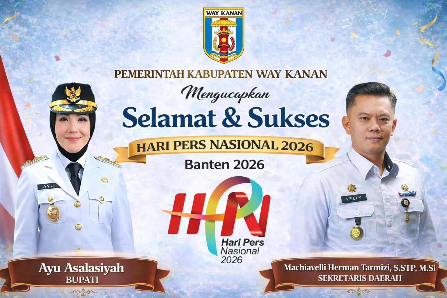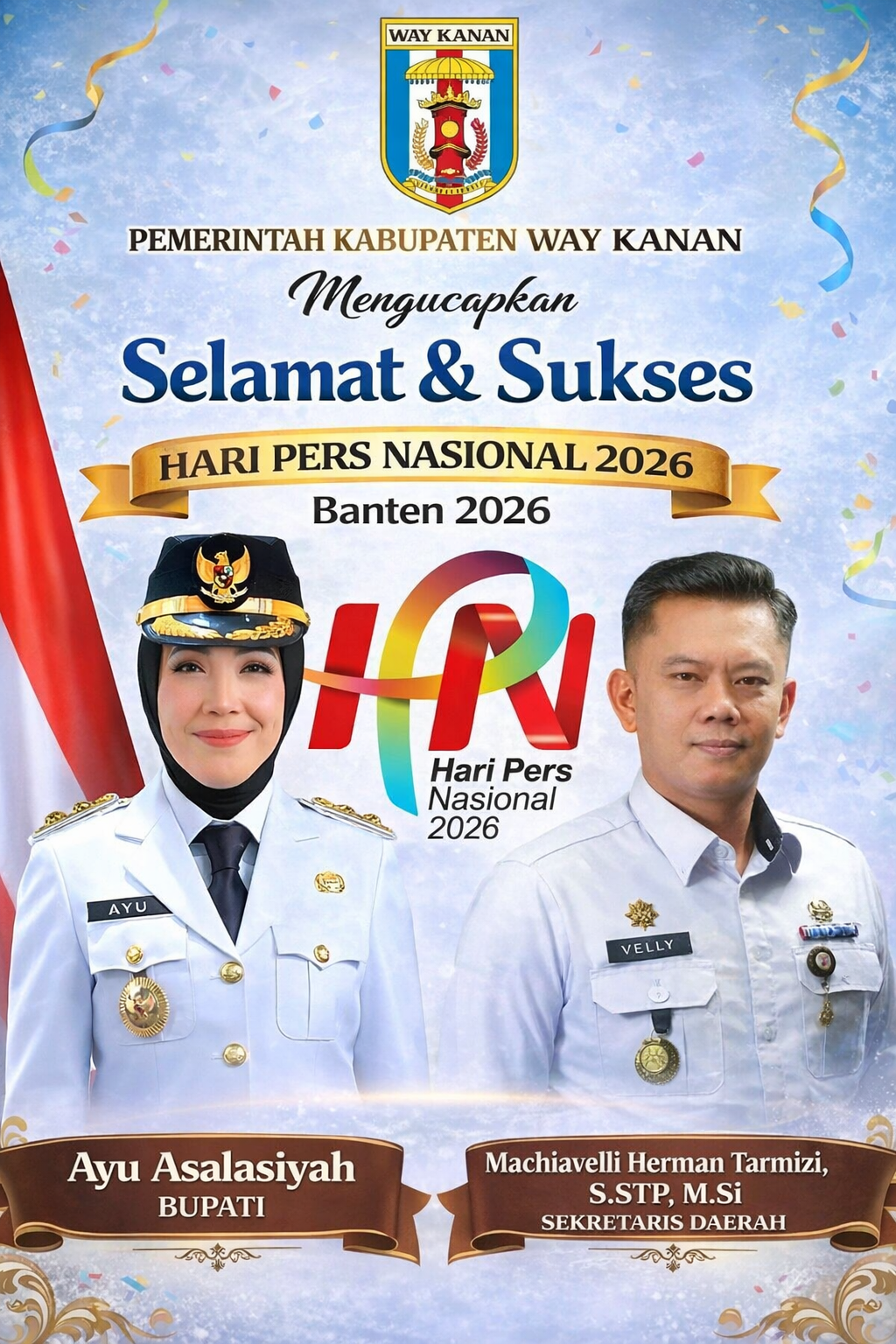 Way Kanan, Tipikor.news β Sekretariat Daerah Kabupaten (Setdakab) Way Kanan menyampaikan ucapan Selamat dan Sukses Hari Pers Nasional (HPN) Tahun 2026 yang diselenggarakan di Provinsi Banten.