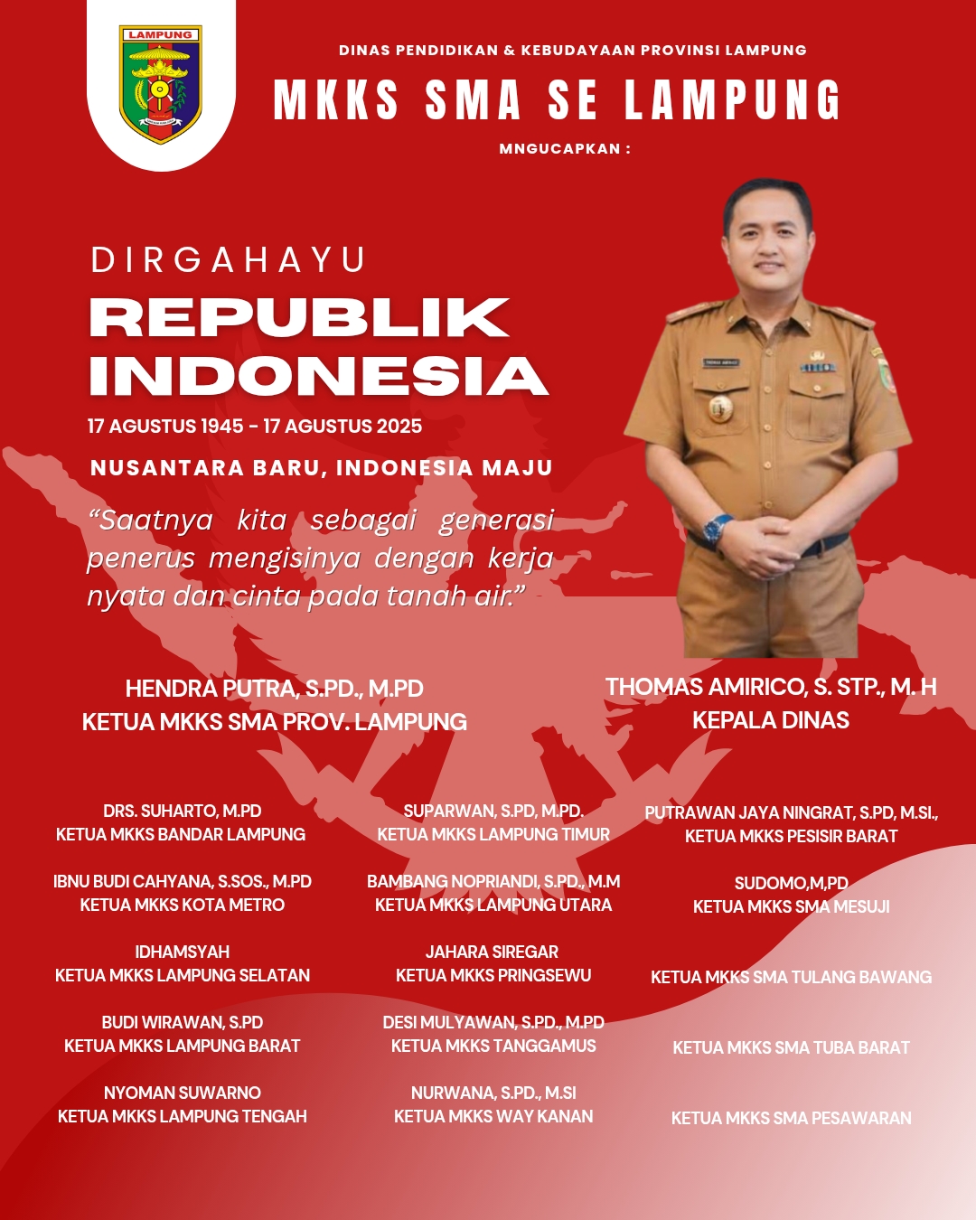 Bandar Lampung, Tipikor.news – Seluruh jajaran Musyawarah Kerja Kepala Sekolah (MKKS) dan kepala Sekolah Menengah Atas (SMA) se-Provinsi Lampung dengan bangga mengucapkan selamat Hari Ulang Tahun Republik Indonesia yang ke-80.