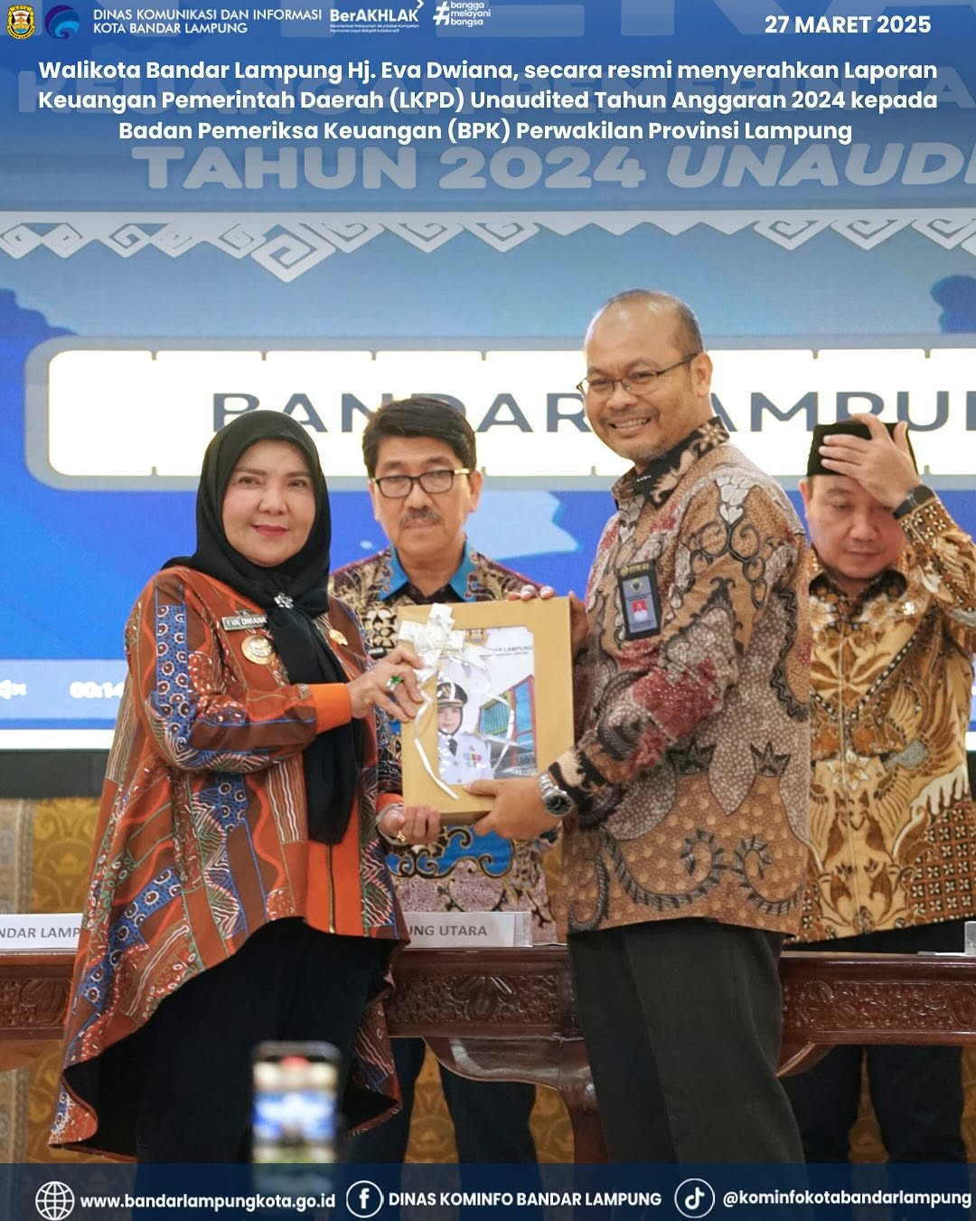 Bandar Lampung – Wali Kota Bandar Lampung Hj. Eva Dwiana secara resmi menyerahkan Laporan Keuangan Pemerintah Daerah (LKPD) Unaudited Tahun Anggaran 2024 kepada Badan Pemeriksa Keuangan (BPK) Perwakilan Provinsi Lampung pada Kamis (27/3/2025).