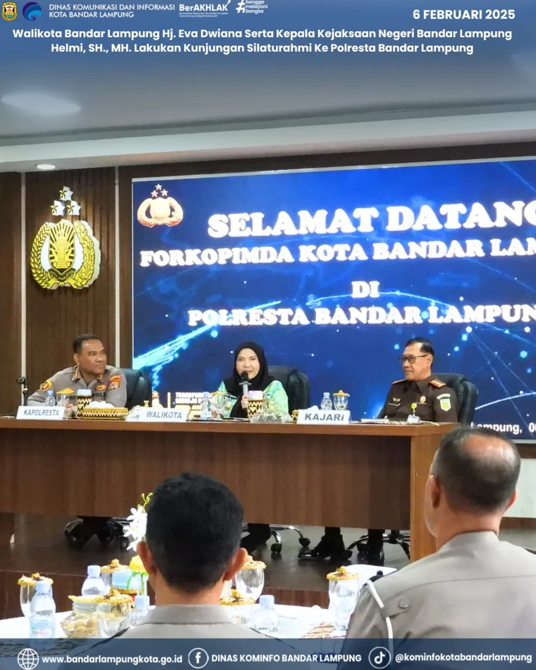 Bandar Lampung – Walikota Bandar Lampung, Hj. Eva Dwiana, bersama dengan Kepala Kejaksaan Negeri Bandar Lampung, Helmi, SH., MH., melakukan kunjungan silaturahmi ke Polresta Bandar Lampung pada Kamis, 6 Februari 2025.