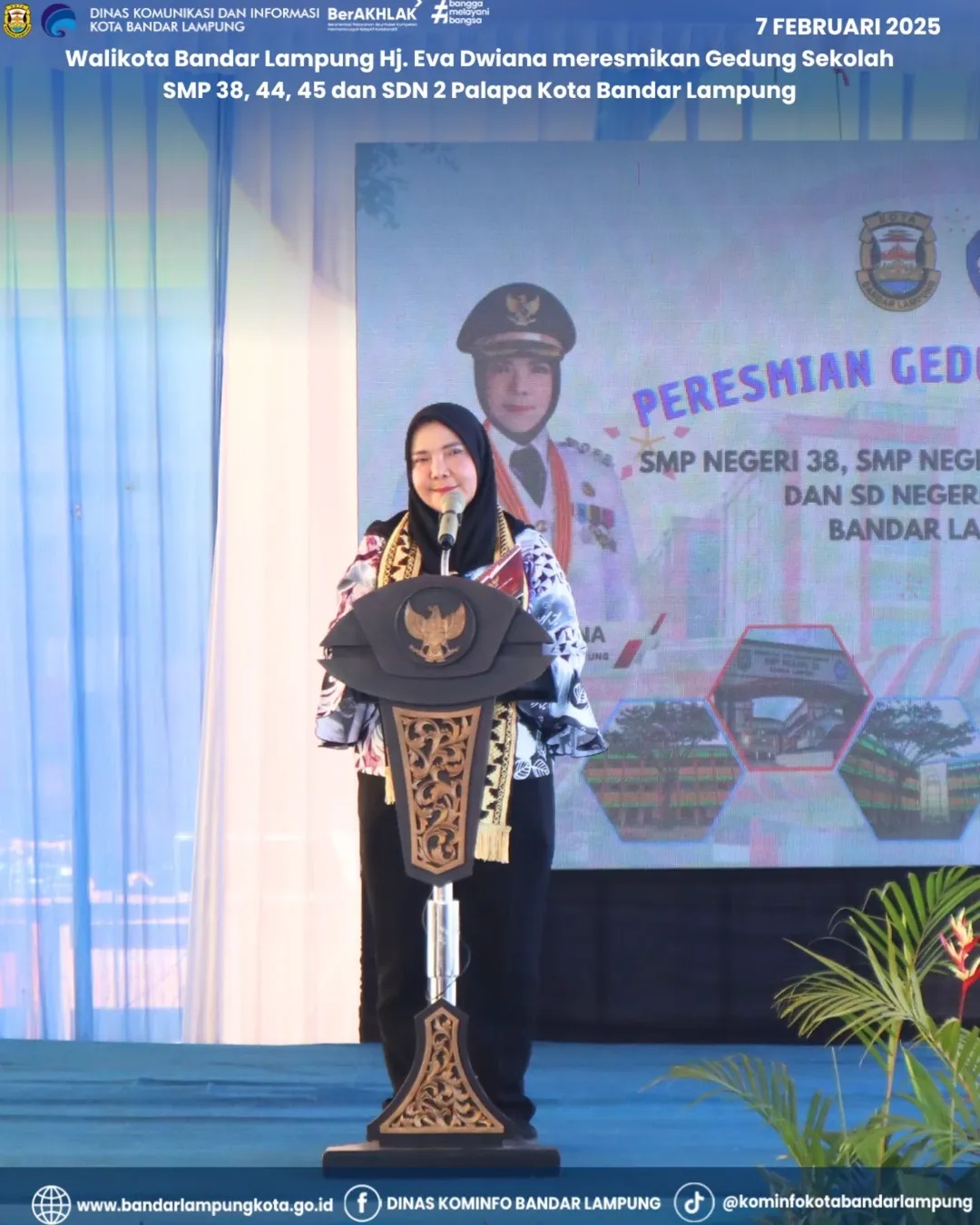 Bandar Lampung – Walikota Bandar Lampung, Hj. Eva Dwiana, meresmikan gedung sekolah baru untuk SMPN 38, SMPN 44, SMPN 45, dan SDN 2 Palapa pada Jumat, 7 Februari 2025. Acara peresmian dipusatkan di lingkungan SMPN 44 Kota Bandar Lampung, Jalan Pulau Buton Raya, Gunung Sulah, Kecamatan Wayhalim, dengan ditandai penandatanganan prasasti dan penekanan tombol sirene.