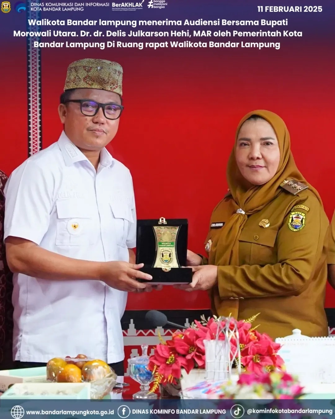 Bandar Lampung – Walikota Bandar Lampung, Hj. Eva Dwiana, menerima audiensi dari Bupati Morowali Utara, Dr. dr. Delis Julkarson Hehi, MAR. Audiensi ini berlangsung di Ruang Rapat Walikota Bandar Lampung pada hari Selasa, 11 Februari 2025.