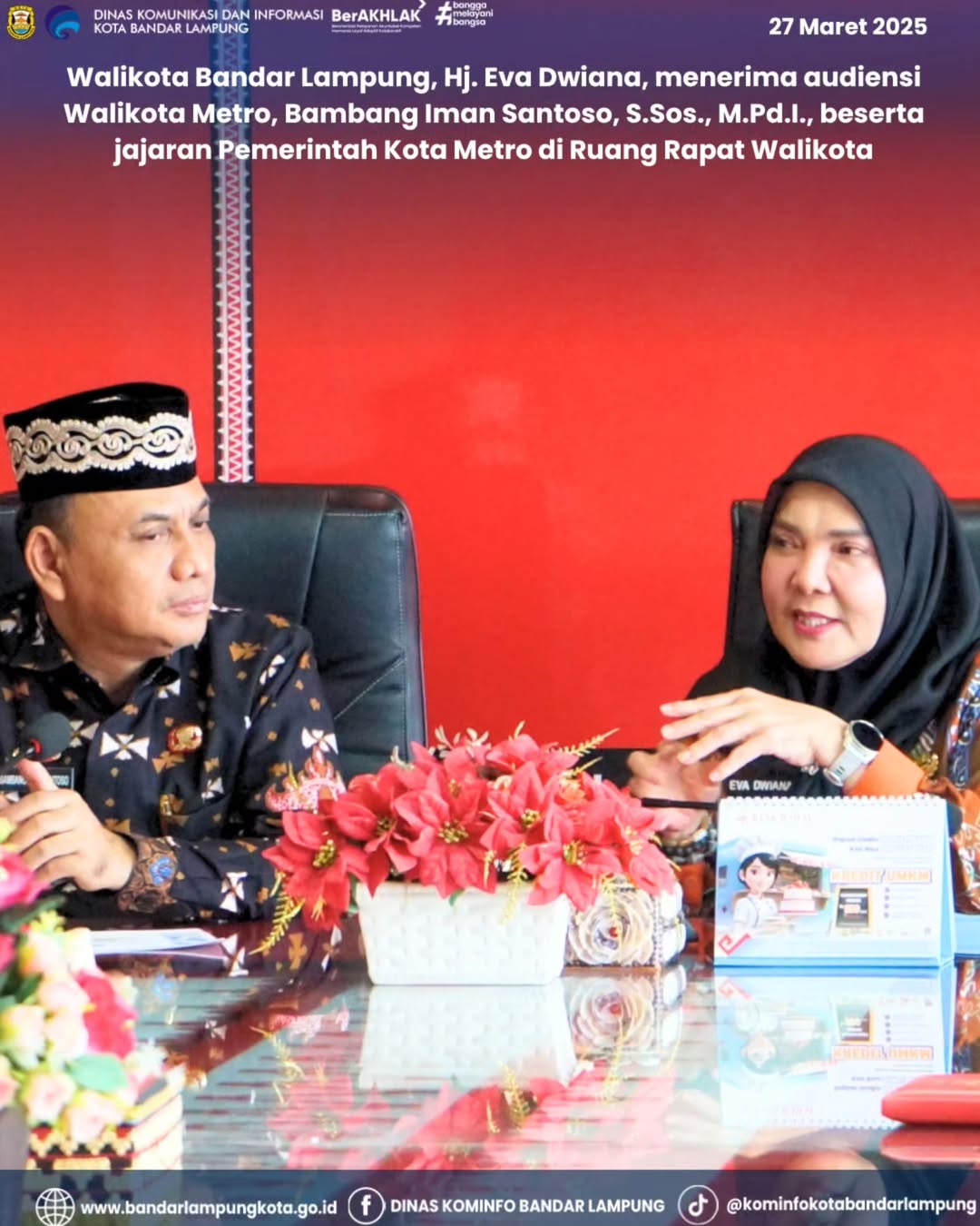 Bandar Lampung, 27 Maret 2025 — Walikota Bandar Lampung, Hj. Eva Dwiana, menerima kunjungan audiensi dari Walikota Metro, Bambang Iman Santoso, S.Sos., M.Pd.I., beserta jajaran Pemerintah Kota Metro di Ruang Rapat Walikota, Kamis (27/3/2025).