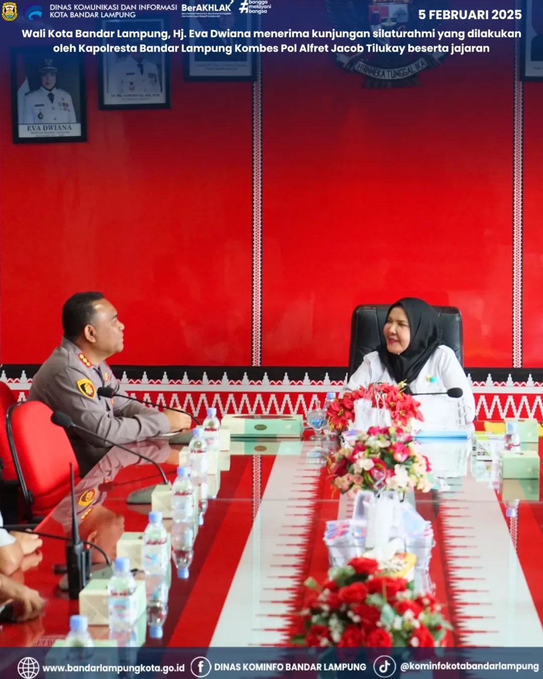 Bandar Lampung – Walikota Bandar Lampung, Hj. Eva Dwiana, menerima kunjungan silaturahmi dari Kapolresta Bandar Lampung, Kombes Pol Alfret Jacob Tilukay, beserta jajaran pada Rabu, 5 Februari 2025. Kunjungan ini bertujuan untuk mempererat hubungan antara Pemerintah Kota Bandar Lampung dan Kepolisian dalam menjaga keamanan dan ketertiban masyarakat.
