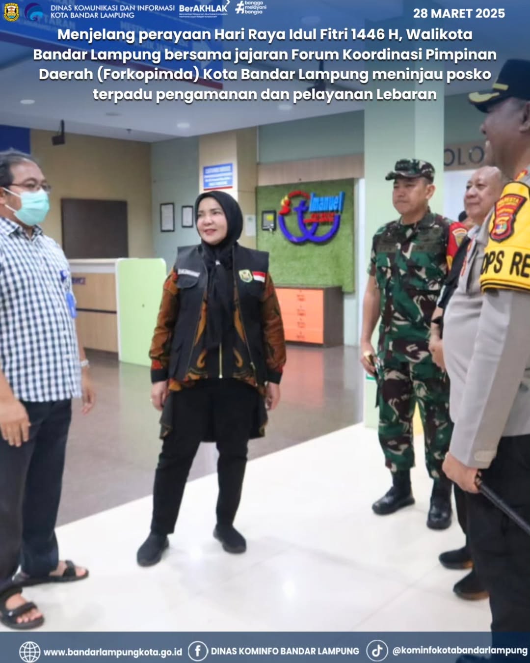 Bandar Lampung – Menjelang perayaan Hari Raya Idul Fitri 1446 H, Walikota Bandar Lampung Hj. Eva Dwiana bersama jajaran Forum Koordinasi Pimpinan Daerah (Forkopimda) Kota Bandar Lampung melakukan peninjauan ke sejumlah posko terpadu pengamanan dan pelayanan Lebaran, Jumat (28/4/2025).